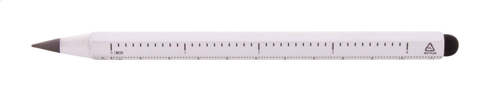 Langlebiger, tintenloser Stift aus recyceltem Aluminium mit Touchpen und Spitze aus einer Metalllegierung, welcher das Papier oxidieren lässt. Der sechseckige Schaft beinhaltet ein 11 cm und 4 Zoll Lineal. Dieser Stift schreibt ähnlich wie ein Bleistift und kann auch wegradiert werden.