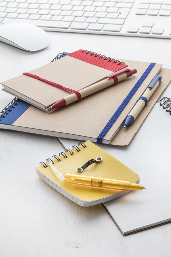 A5 Spiral-Notizbuch, 60 Seiten (blanko) und Kugelschreiber, blauschreibend, aus Recyclingpapier.