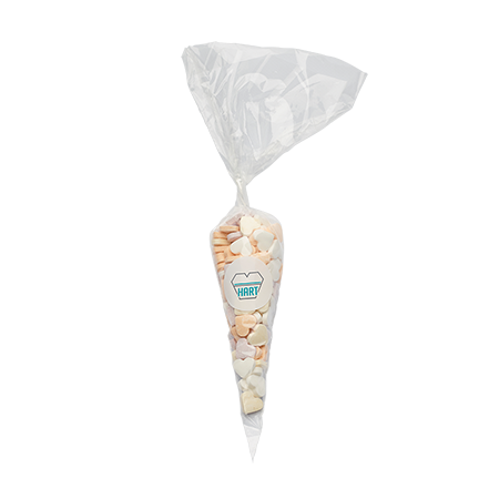 Spitztüte 180 x 370 mm, mit vollfarbigem Etikett, verschiedene Füllungen zur Auswahl: DutchDex dextrose Mints, extra starke „Dreiecks“-Mints, Fruchtherzen, Fruchtkugeln, Fruchtherzen, Minzherzen, Pfefferminz, Zuckerherzen, Tum Tum, Goldschokoladenperlen, Knusper-Schokoladenfestival, Knusper-Schokoladenjuwelen, Goldglimmer-Vollmilchschokolade, Kleine Herzen Gold, Kleine Herzen Rot/Weiß, Marmor-Gold-Schokolade pur, Mikro-Eier Vollmilchschokolade, Mini-Schokoladenperlen Gold, Mini-Schokoladenperlen Kupfer, Roséglimmer-Vollmilchschokolade, Silberglimmer-Vollmilchschokolade, Sommer-Konfetti-Schokolade pur oder Pralinen-Regenpfeifer-Eier.