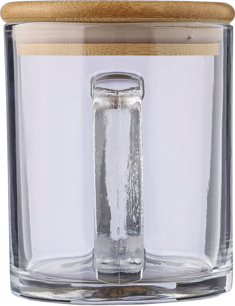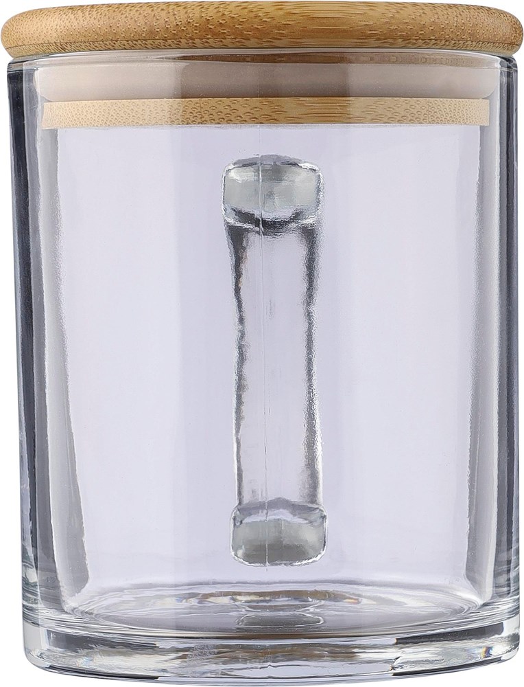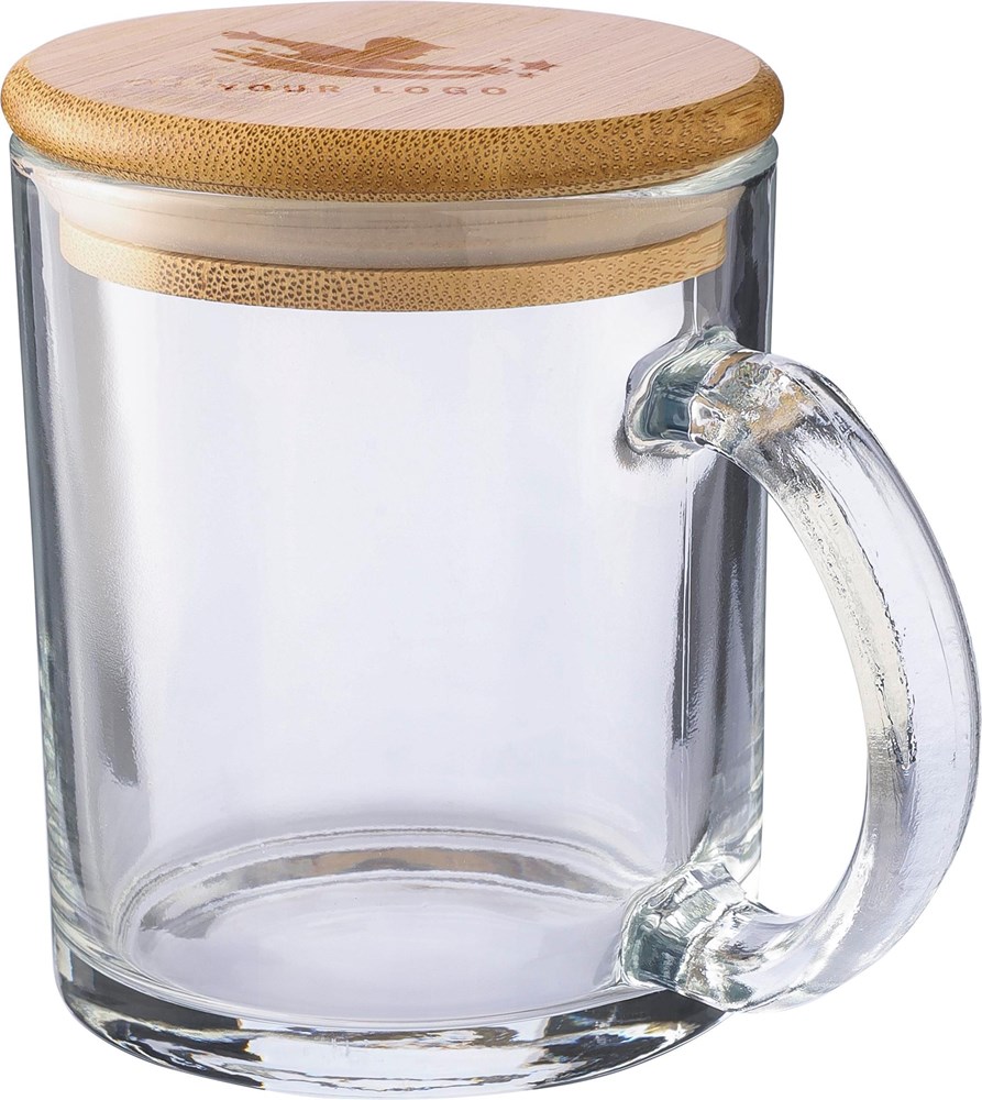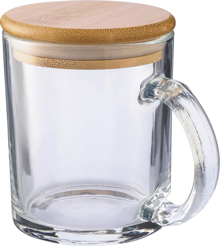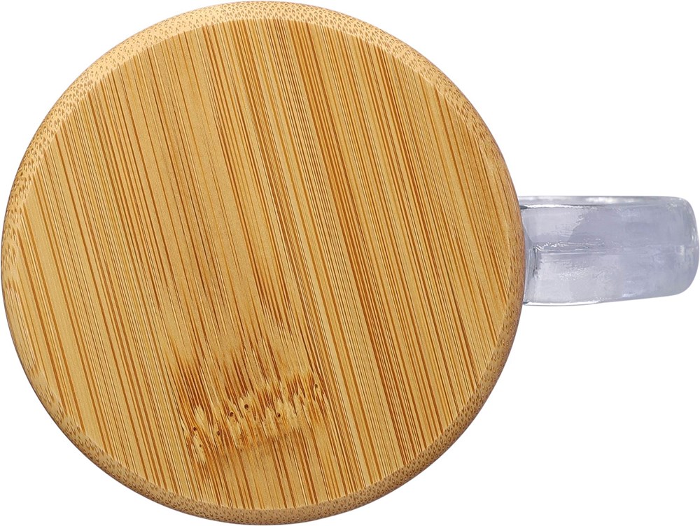 Trinkbecher aus recyceltem Glas (300 ml), hergestellt aus Natriumkalzium, mit einem Deckel aus Bambus, der als Untersetzer verwendet werden kann. Einzeln verpackt in einer braunen Pappschachtel.