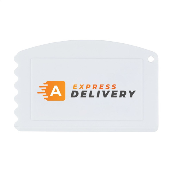 Eiskratzer aus recyceltem Kunststoff. Der Eiskratzer im praktischen Kreditkartenformat lässt sich mühelos an einem Schlüsselring befestigen. Hergestellt in Europa.