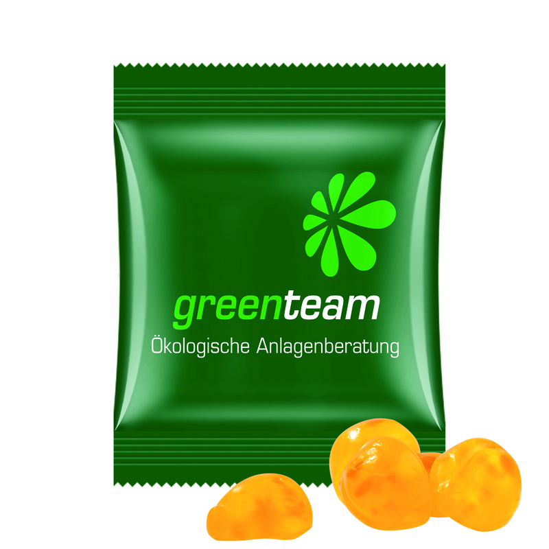 Trolli Fruchtgummi in Tüte aus weißer Folie, kompostierbar, individuell bedruckt. Inhalt: Trolli Vitamin-Fruchtgummi, mit Fruchtsaft, fruchtigen Stückchen und 10 Vitaminen, in der Geschmacksrichtung Pfirsich, 15 g