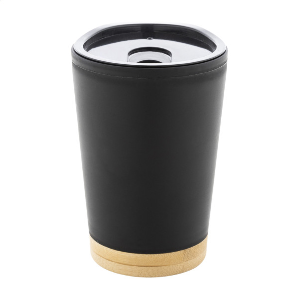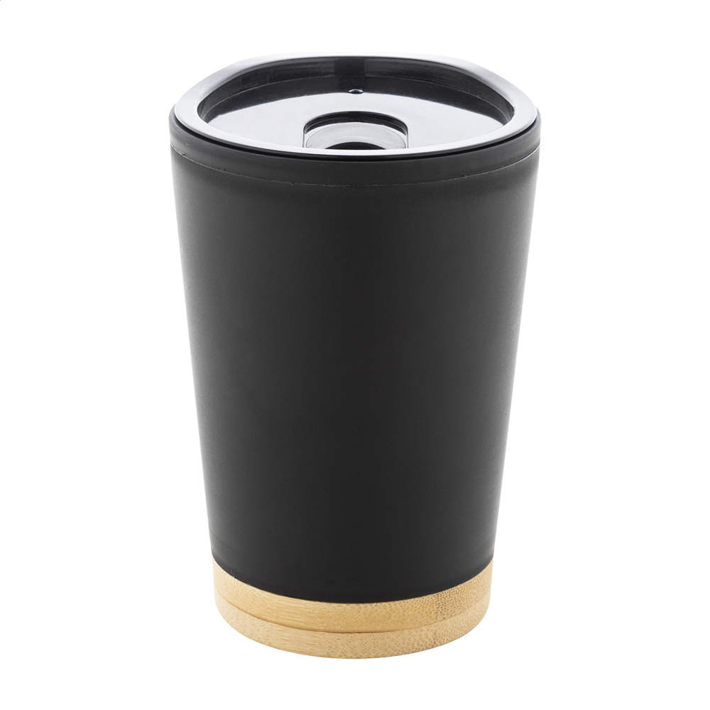 Thermobecher aus doppelwandigem PP-Kunststoff mit Trinkdeckel und Bambusboden. Füllmenge: 260 ml.