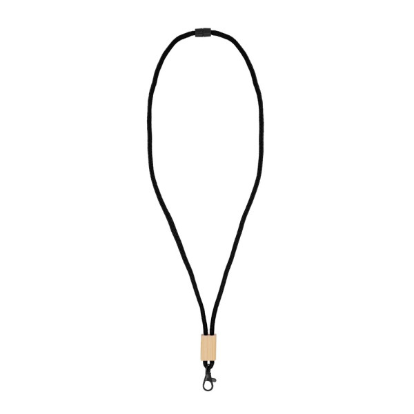 Kordel-Lanyard aus R-PET Paracord mit Kunststoff-Sicherheitsverbindung und schwarzem Karabiner und Panikverschluss. Das Schlüsselband ist mit einem Bambusschieber verstellbar, der viel Platz für das Branding bietet.