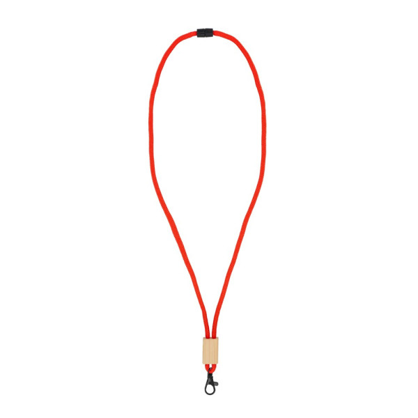 Kordel-Lanyard aus R-PET Paracord mit Kunststoff-Sicherheitsverbindung und schwarzem Karabiner und Panikverschluss. Das Schlüsselband ist mit einem Bambusschieber verstellbar, der viel Platz für das Branding bietet.