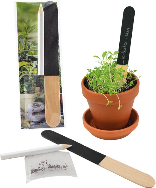 Erfreuen Sie Ihre Kunden mit einer kleinen Kräuteroase. Das Tütchen enthält Samen einer Kräutermischung, ein wiederbeschreibbares Holzstäbchen zum Markieren der Saatstelle und einen passenden Stift. Die Karte kann im Standardmotiv mit einem Logo versehen, oder, ebenfalls ab 250 Stück, individuell gestaltet werden. Inhalt: Holzstäbchen, Stift weiß, Samen: Kräutermischung
