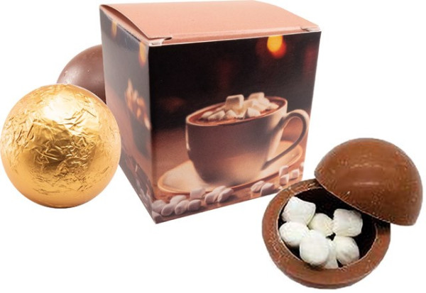 Ein ganz besonderes Geschmackserlebnis entfaltet die mit Marshmallows gefüllte Schoko-Kugel, sobald sie in heißer Milch aufgelöst ist. Ein köstlicher Genuss in der kalten Jahreszeit. Ihre Werbebotschaft oder eine eigene Gestaltung der Würfelpackung ist bereits ab 250 Stück möglich.