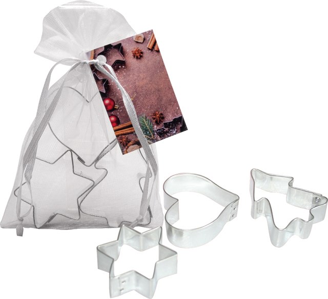 Im hübschen Organzasäckchen befinden sich drei Backförmchen für Ihre Weihnachtsbäckerei. Die langlebigen und immer wiederverwendbaren Ausstechformen aus Weißblech, Made in Germany, sind ein sympathisches und nützliches Giveaway für Ihre Kunden. Ihr Werbeeindruck oder eine individuelle Gestaltung der Karte ist ab 250 Stück möglich. Inhalt: 3 Ausstechformen, je ca. 5 cm (Stern, Tannenbaum, Herz), Rezept auf Karte (ohne Gebäck)