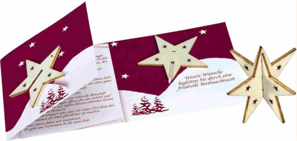 Diese ansprechende Weihnachtskarte enthält 2 Holzteile, die zu einem Holzstern zusammengesteckt werden können. Platz für den Werbedruck ist auf dem Standardmotiv der Karte oder eine eigene Gestaltung, jeweils ab 100 Stück. Ein Kuvert ist separat erhältlich Art. 6101. Inhalt: Holzstern zum Stecken (ca. 65 mm)