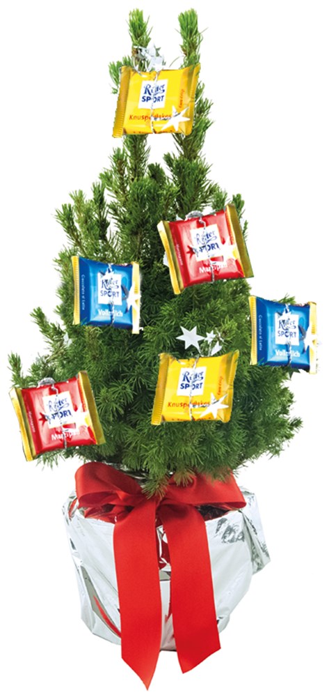 Inhalt: Bäumchen 35-45 cm geschmückt mit 10 Ritter Sport Täfelchen (je 16 g), Topffolie silber, Schleife blau