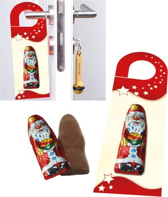 Eine kleine süße weihnachtliche Überraschung für Ihre Gäste. Mit diesem Schokoladen-Weihnachtsmann zaubern Sie mit Sicherheit ein Lächeln auf das Gesicht Ihrer Gäste, wenn diese die süße Überraschung an ihrer Tür vorfinden. Platz für den Werbedruck ist auf dem Standardmotiv oder eine eigene Gestaltung des Türanhängers, jeweils bereits ab 250 Stück.