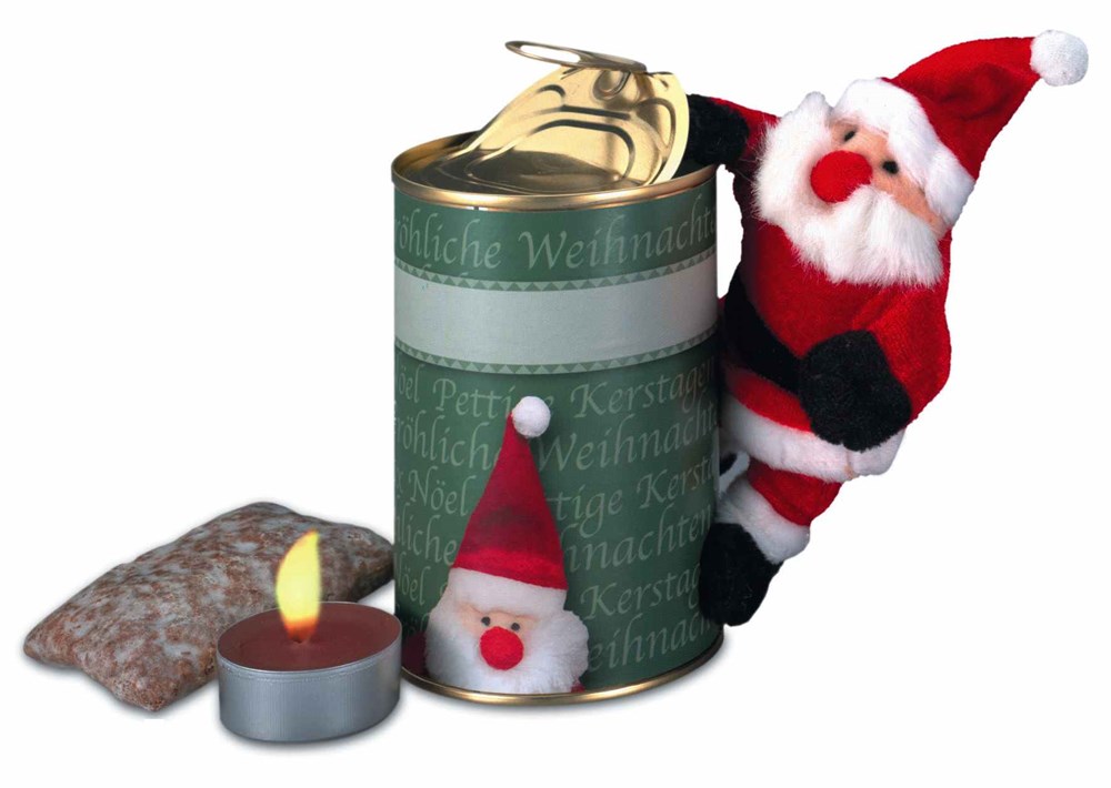 Die Dose mit Aufreißdeckel enthält einen magnetischen Weihnachtsmann, Lebkuchen sowie ein Duft-Teelicht. Ein schönes Präsent zu Weihnachten. Platz für Ihren Werbeeindruck ist auf dem Standardmotiv der Banderole oder eine eigene Gestaltung, jeweils ab 100 Stück.