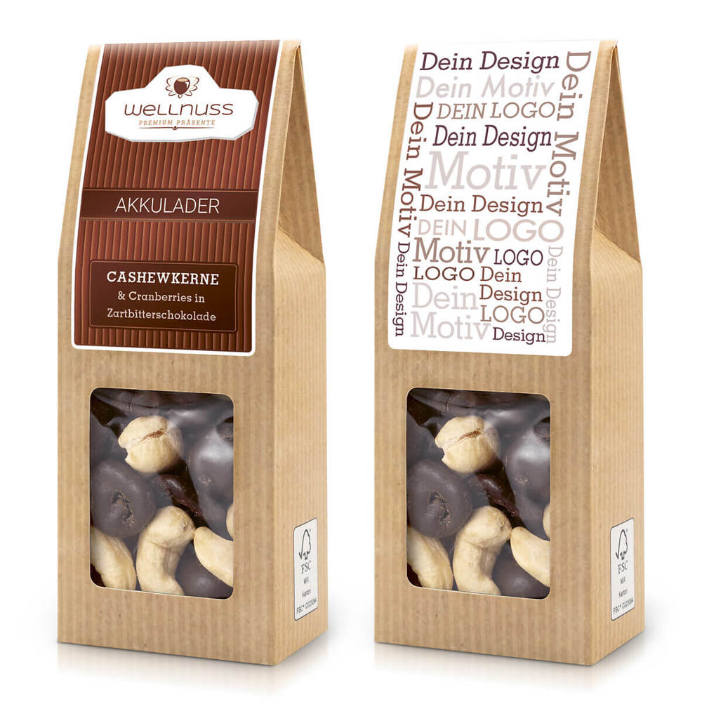 Ab 250 Stück mit Ihrem Motiv im 4c Druck auf dem Etikett der Faltschachtel, ab 2.500 Stück bedrucken wir den Faltschachtelkarton vollflächig: Der aufmerksamkeitsstarke Bestseller. Die Faltschachtel als nachhaltiges Premium-Giveaway. Dieses Duo wird nicht nur bei uns im Büro immer schnell weggeknabbert: ein wenig Zartbitterschokolade für die Seele, dazu naturbelassene Cashewkerne für etwas Crunch und ein gutes Gewissen, abgerundet durch die fruchtig-herbe Note der Cranberries. Und der Spaß beginnt schon beim Hineingreifen in die Tüte: Wie viele Schokoladen-Teile habe ich erwischt? Was sagt das Akkulader-Orakel?