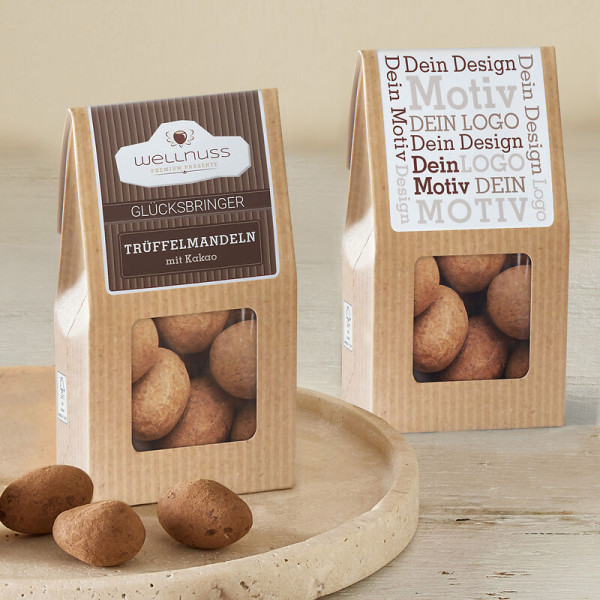 Ab 500 Stück mit Ihrem Motiv im 4c Druck auf dem Etikett der Faltschachtel, ab 2.500 Stück vollflächig bedruckt im Offsetdruck: Unser aufmerksamkeitsstarker Bestseller. Die Mini-Faltschachtel als nachhaltiges Premium-Giveaway. Ein Mandelkern, umhüllt von feinster belgischer Schokolade, bedeckt mit einem Hauch Kakaopulver. Die Kombination aus fein-herben Kakao mit zart-schmelzender Schokolade und einer knackigen Mandeln ist einfach unwiderstehlich.