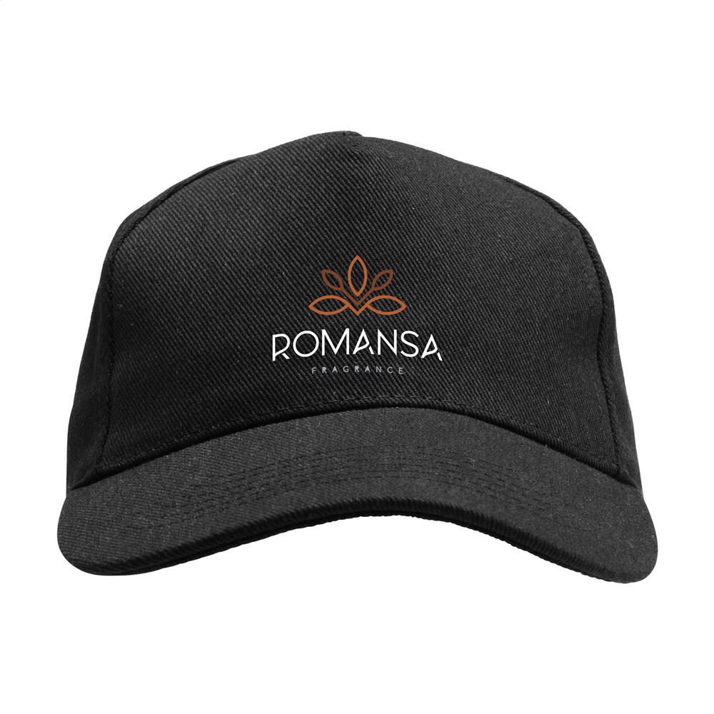 Komfortable Kappe in extra schwerer Qualität. Gefertigt aus 60% recycelter Baumwolle und 40% recyceltes Polyester. Mit vorgeformtem Schirm und verstellbarem Verschluss mit Metallclip auf der Rückseite. Diese Kappe mit 5 Panels hat einen gebogenen Schirm und gestickte Ösen zur Belüftung.