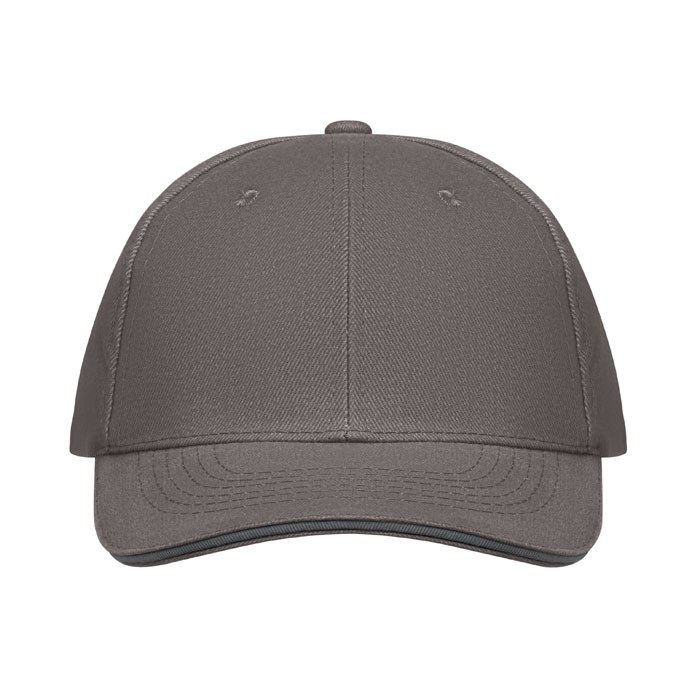 6-Panel-Baseball-Cap aus gebürsteter Baumwolle 260 g/m² mit silberner Schnalle aus Stahl mit Einstecklasche. Sechs farblich abgestimmte, umstickte Belüftungslöcher. Größe 7 1/4.