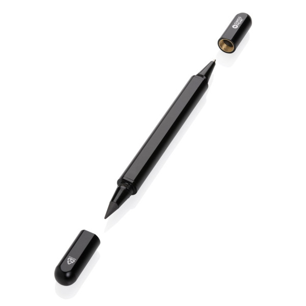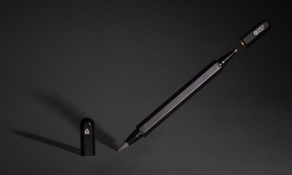 Erleben Sie ein überragendes Schreibgefühl mit diesem außergewöhnlichen Stift aus RCS-zertifiziert recyceltem Aluminium. Er kombiniert Stil und Umweltfreundlichkeit mit 83% recyceltem RCS-zertifiziertem Aluminium. Der Stift verfügt über zwei Spitzen - eine Graphitspitze auf der einen Seite und eine Kugelschreiberspitze. Schreibbreite 1 mm, und blaue Tinte für eine Schreiblänge von bis zu 1200 Meter. Verpackt in einer schwarzen Swiss Peak Geschenkbox aus FSC®-Material. Gesamter recycelter Inhalt auf Basis des Artikelgewichts: 83%.