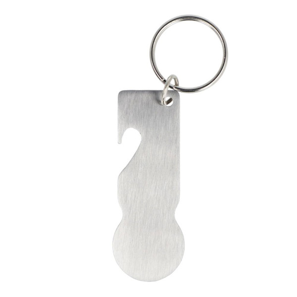 Schlüsselanhänger aus Edelstahl mit integriertem Flaschenöffner und Einkaufswagenlöser, kompatibel mit den meisten westeuropäischen Einkaufswagen. 23 mm Münzkopf. Praktisches Design mit viel Platz für das Branding.