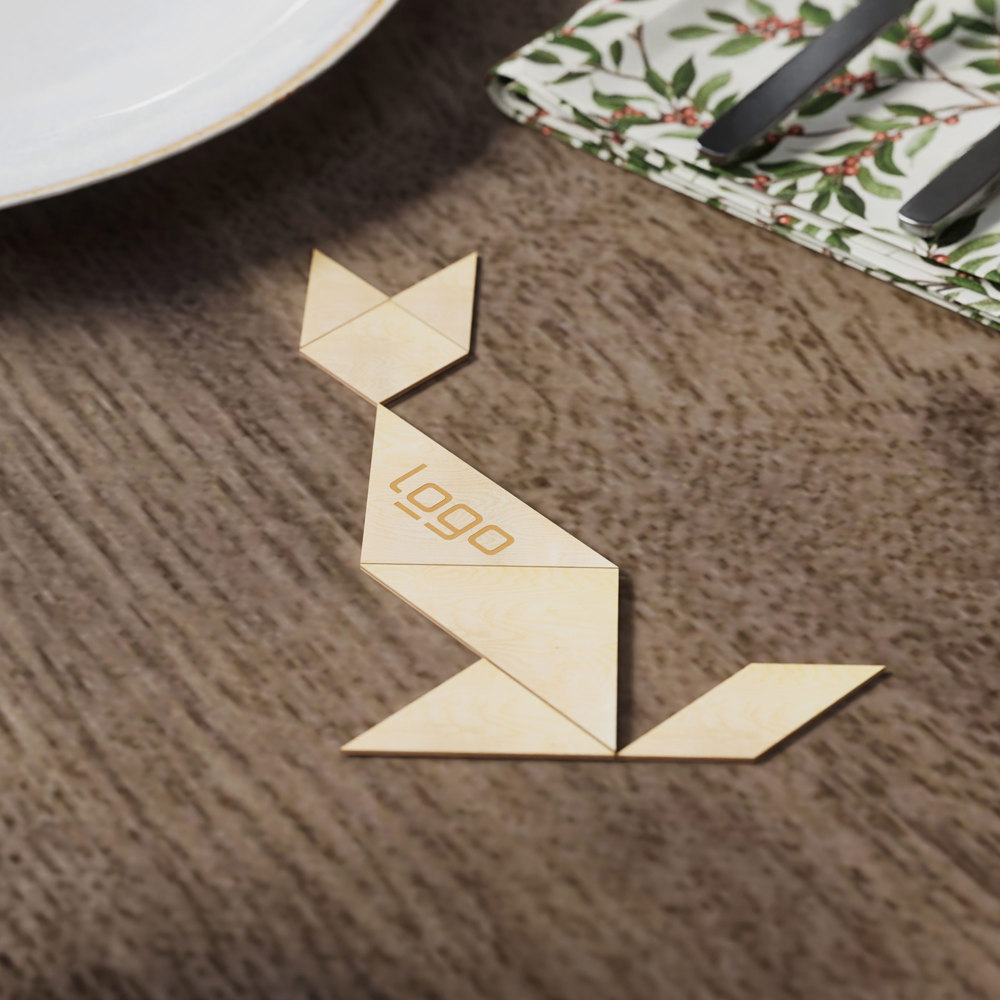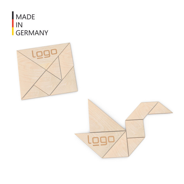 Mit unserem Tangram Kreativ-Puzzle (FSC® zertifiziert), auch bekannt als „Siebenbrett“, verbinden Sie Spielspaß mit nachhaltigem Denken. Die sieben Tans in geometrischen Formen wie Dreiecken oder Quadraten bieten unbegrenzte Gestaltungsmöglichkeiten. Es sind über 6.000 Legemöglichkeiten bekannt – ob Menschen, Tiere, Gegenstände oder abstrakte Muster, Ihrer Kreativität sind keine Grenzen gesetzt. Das Puzzle, oft auch "Siebenschlau" genannt, lässt sich durch Lasergravur personalisieren – ob Firmenlogo, Name oder ein individuelles Motiv. Verpackt wird es standardmäßig in einem umweltfreundlichen Pergamin-Flachbeutel. Gegen Aufpreis ist auch ein robustes und schickes Baumwollsäckchen erhältlich. Die Veredelung und Produktion des Tangrams ist "made in Germany". Ein vielseitiges Produkt für kreative Köpfe, das Freude bereitet und ein Zeichen für Nachhaltigkeit setzt! FSC Mix Credit (TSUD-COC-001718-NA)