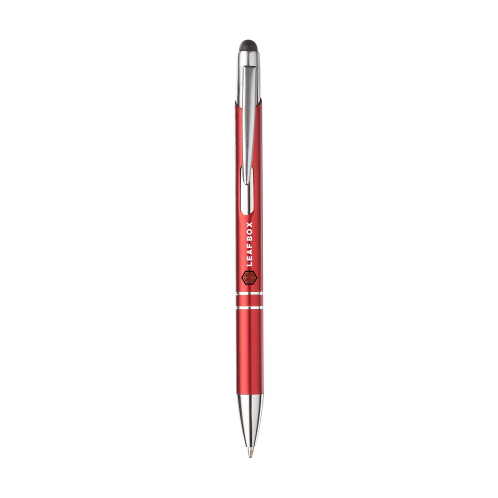 Blauschreibender Kugelschreiber mit Aluminiumgehäuse, gummierte Spitze zum Bedienen von Touchscreens (wie iPhone/iPad), mattfarbenes Metallgehäuse und Metallclip/-druckknopf.