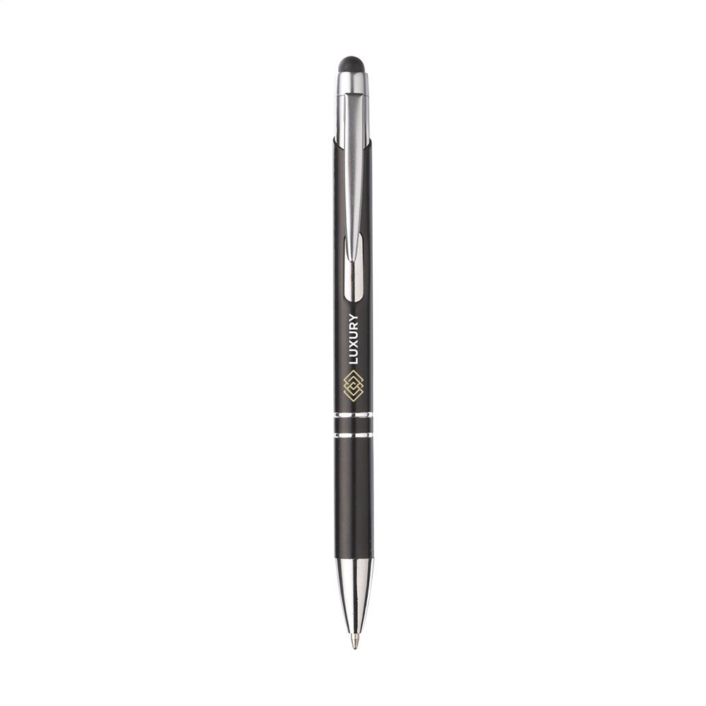 Blauschreibender Kugelschreiber mit Aluminiumgehäuse, gummierte Spitze zum Bedienen von... mehr