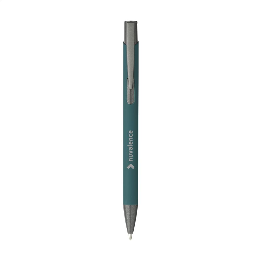 Blauschreibender Kugelschreiber mit einem Gehäuse aus recyceltem Aluminium. Das Gehäuse ist mit einer gummierten Soft-Touch-Oberfläche versehen. Mit Metallclip/Druckknopf. RCS-zertifiziert. Gesamtes recyceltes Material: 94%. Durch die Verwendung von recyceltem Aluminium werden bei der Herstellung dieses Produkts weniger neue Rohstoffe verwendet. Das bedeutet weniger Energieverbrauch und weniger Wasserverbrauch.