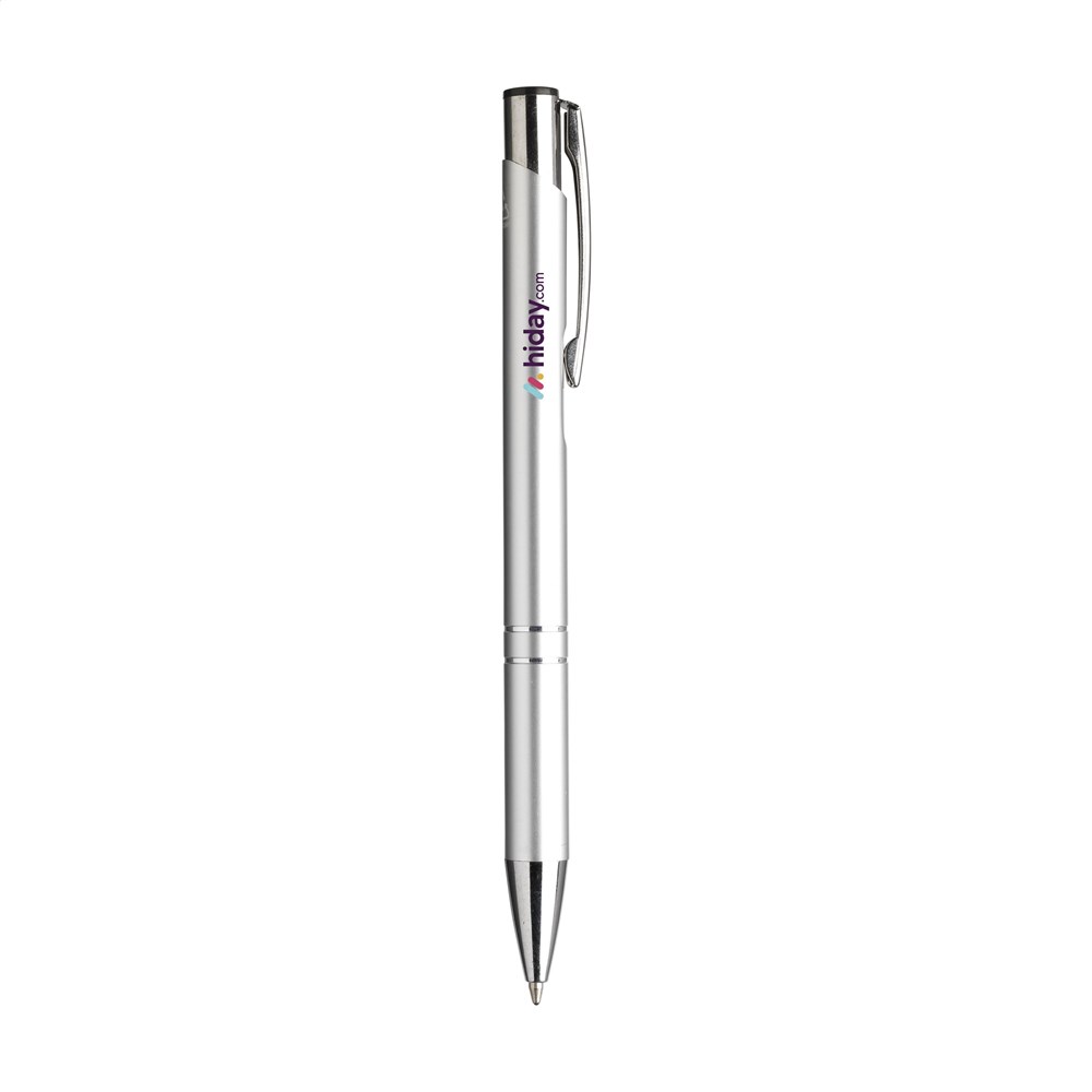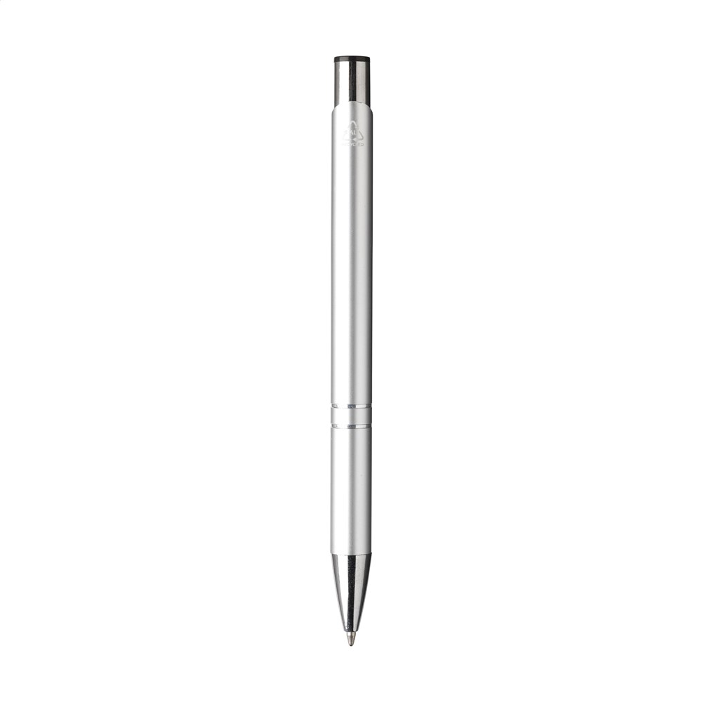 Blauschreibender Kugelschreiber aus recyceltem Aluminium. Der Halter ist mit einer wunderschön glänzenden Oberfläche im Metallic-Look versehen. Mit Metallclip. Durch die Verwendung von recyceltem Aluminium werden bei der Herstellung dieses Produkts weniger neue Rohstoffe verwendet. Das bedeutet weniger Energieverbrauch und weniger Wasserverbrauch.