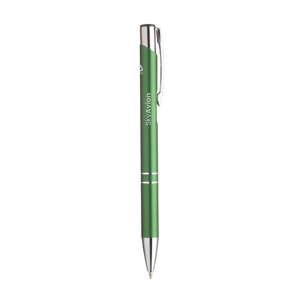 Blauschreibender Kugelschreiber aus recyceltem Aluminium. Der Halter ist mit einer wunderschön glänzenden Oberfläche im Metallic-Look versehen. Mit Metallclip. Durch die Verwendung von recyceltem Aluminium werden bei der Herstellung dieses Produkts weniger neue Rohstoffe verwendet. Das bedeutet weniger Energieverbrauch und weniger Wasserverbrauch.