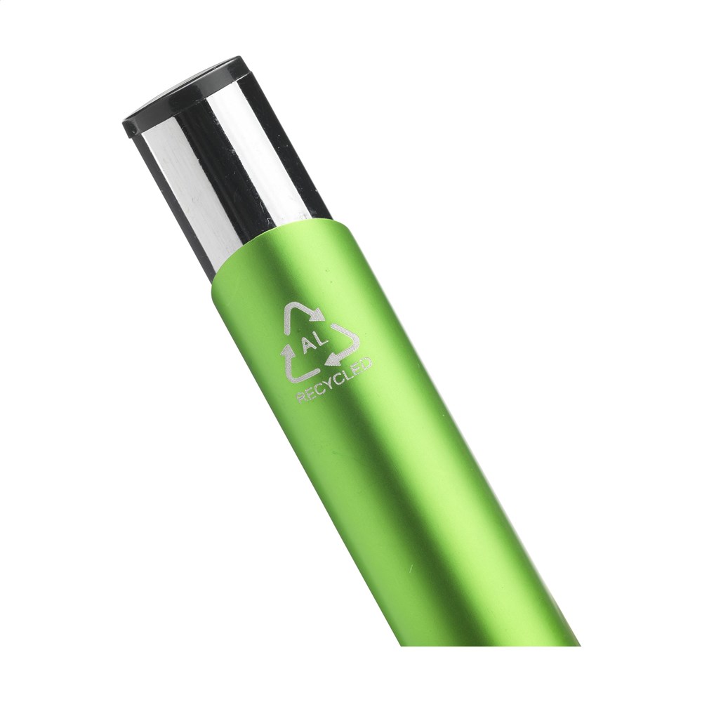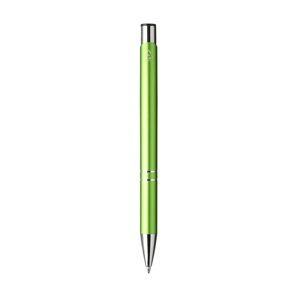 Blauschreibender Kugelschreiber aus recyceltem Aluminium. Der Halter ist mit einer wunderschön glänzenden Oberfläche im Metallic-Look versehen. Mit Metallclip. Durch die Verwendung von recyceltem Aluminium werden bei der Herstellung dieses Produkts weniger neue Rohstoffe verwendet. Das bedeutet weniger Energieverbrauch und weniger Wasserverbrauch.