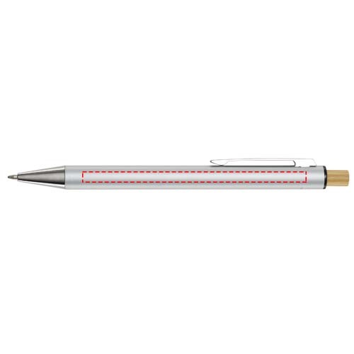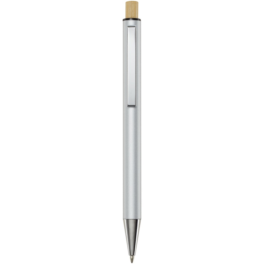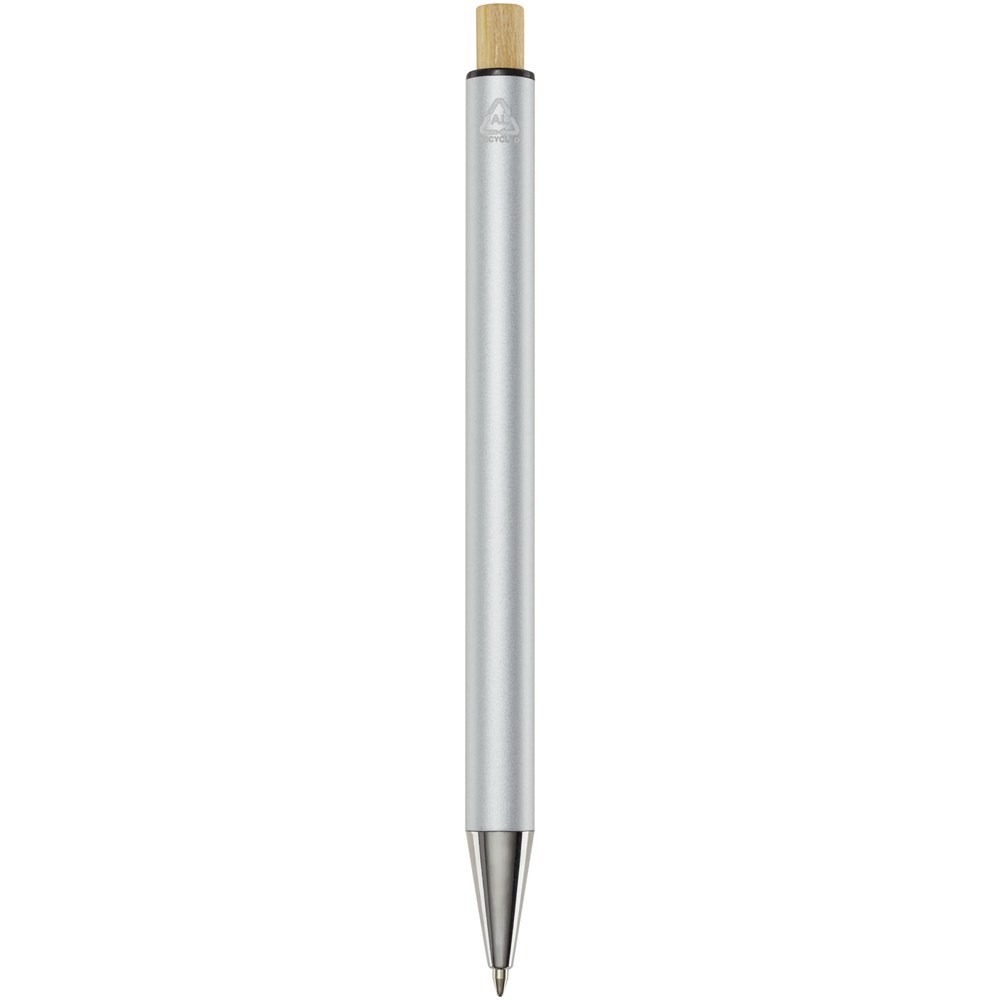 Der Cyrus Kugelschreiber ist aus recyceltem Aluminium hergestellt, was weniger Energie benötigt als die Herstellung von Aluminium aus Rohstoffen. Es reduziert außerdem die Abfallmenge auf Mülldeponien und trägt dazu bei, natürliche Ressourcen zu schonen und Treibhausgasemissionen zu reduzieren. Druckknopf ist aus Bambus gefertigt. Tintenfarbe: Schwarz. Schreiblänge: 800 Meter. Spitzengröße: 1,00 mm.