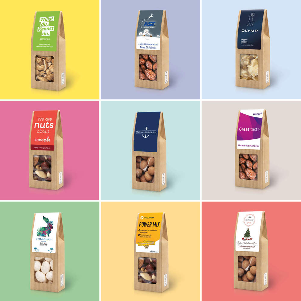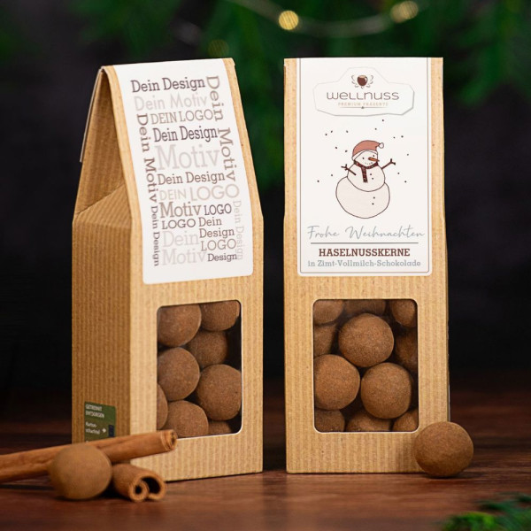Ab 250 Stück mit Ihrem Motiv im 4c Druck auf dem Etikett der Faltschachtel, ab 2.500 Stück bedrucken wir den Faltschachtelkarton vollflächig: Der aufmerksamkeitsstarke Bestseller. Die Faltschachtel als nachhaltiges Premium-Giveaway. Über knackige Haselnüsse spannt sich ein Mantel aus belgischer Schokolade, bestäubt mit feinstem Zimt. Schon beim ersten Biss verströmt der edle Zimt sein zartes Aroma und verschmilzt im Mund mit der leichten Süße der Vollmilchhülle, bevor mit leichtem Knacken die Haselnuss das Geschmackserlebnis abrundet. Sie suchen eine andere Größe? Dieses Premium Präsent ist auch als Mini Faltschachtel und Maxi Faltschachtel erhältlich.