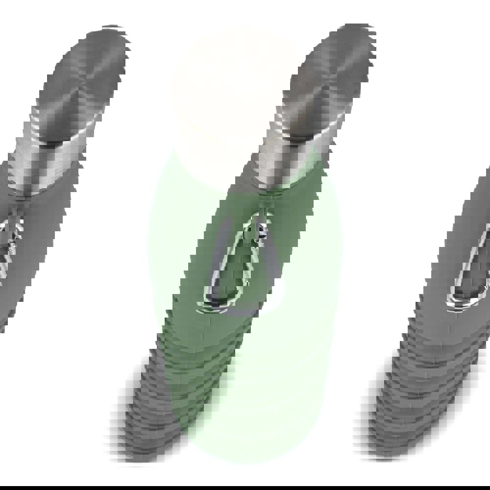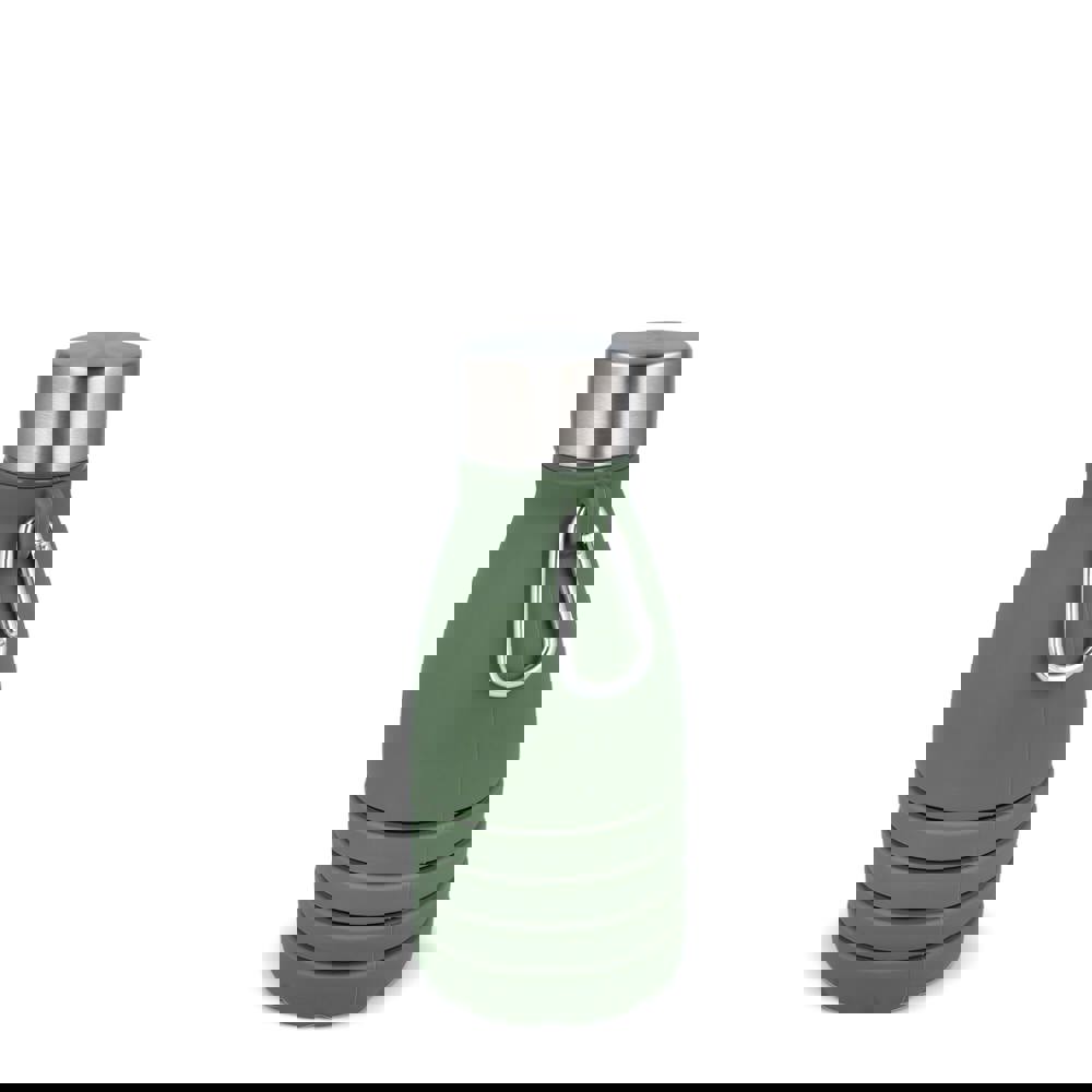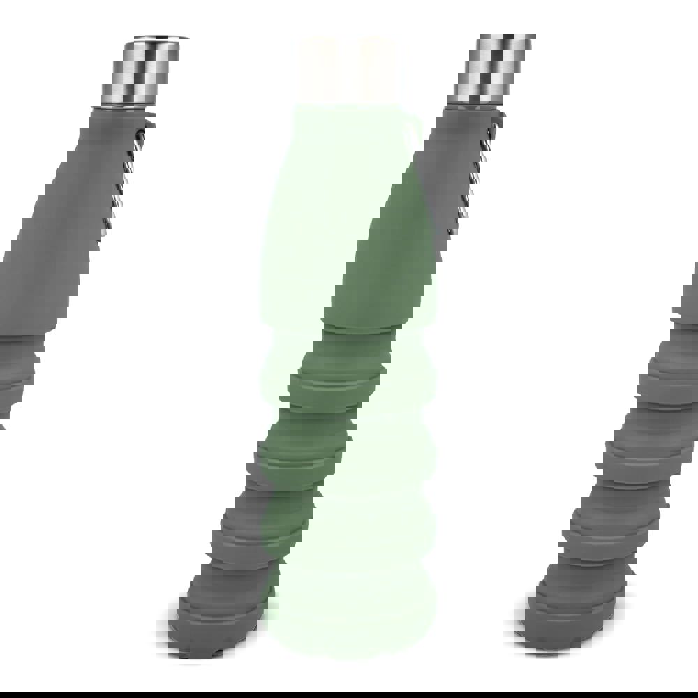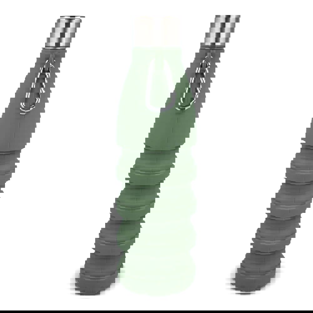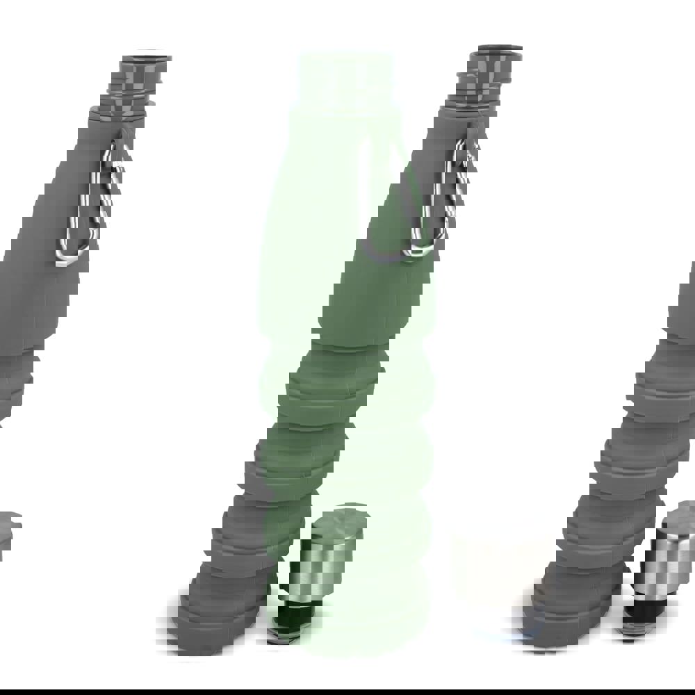 Faltbare Wasserflasche aus Silikon mit Karabinerhaken zum Befestigen an Ihrer Tasche. Sie fasst 550 ml Flüssigkeit.