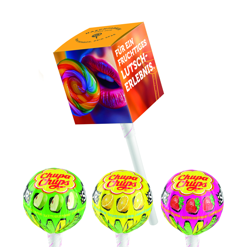 Chupa Chups Kugel Lolly in Werbebox aus weißem Karton, individuell bedruckt. Inhalt: 1 Chupa Chups Kugel Lolly, Fruchtmischung (Apfel, Orange, Erdbeere, Kirsche), 12 g
