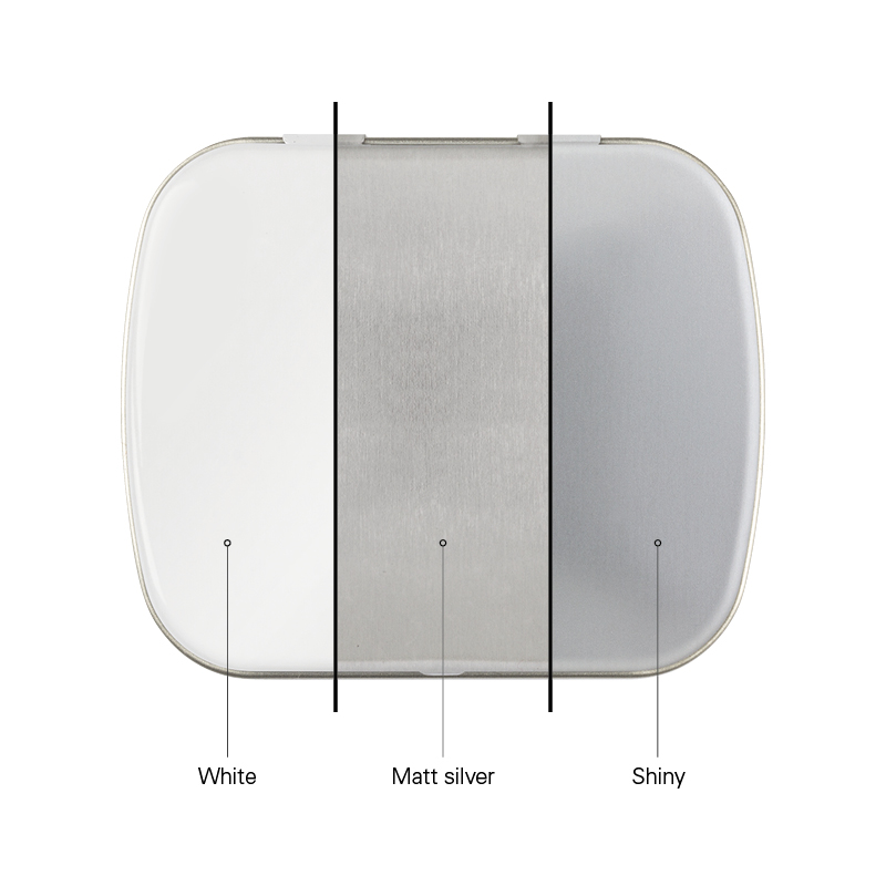 Scharnierdeckeldose mit gewölbtem Deckel, weiß aus Metall, individuell bedruckt. Mit Originalitätsverschluss und Aufreißperforation, Weißblech 98% recycelbar. Inhalt: Mentos Kaudragee Fruit (Erdbeere, Orange, Zitrone - gemischt), 23 g