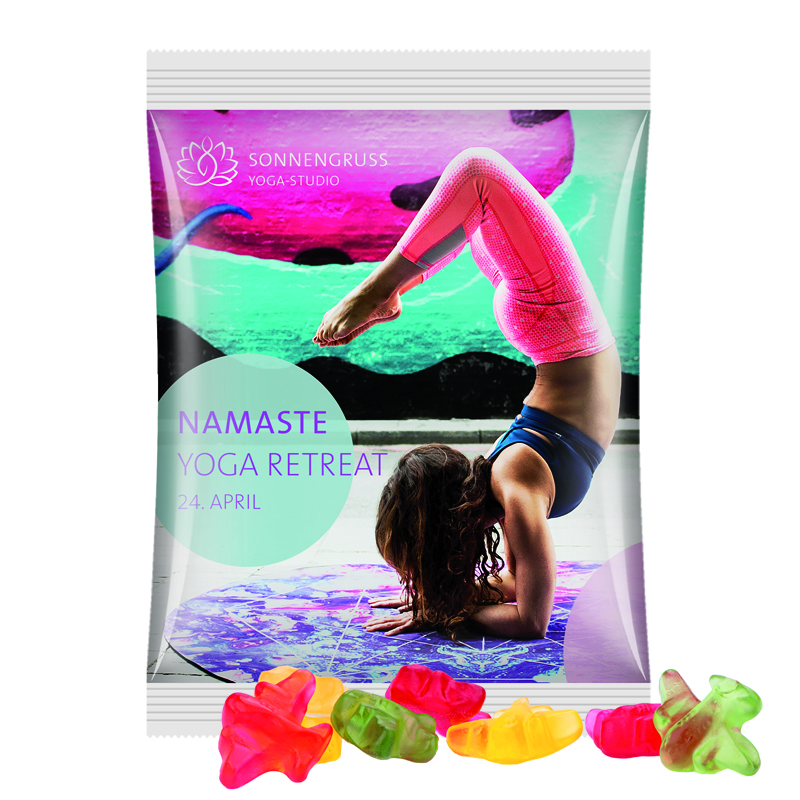 Trolli Fruchtgummi in Tüte aus weißer Folie, individuell bedruckt. Inhalt: Trolli Fruchtgummi Flugzeuge, in Premium Qualität mit 10 % Fruchtsaftanteil, bunt gemischt, 50 g