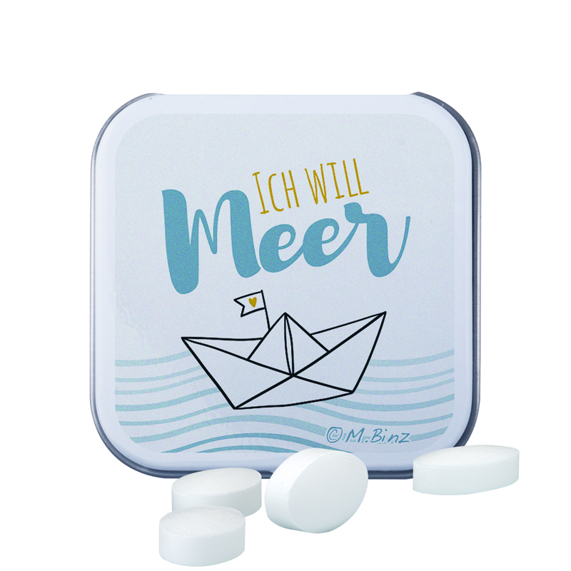 Quadratische weiße Metalldose mit Scharnierdeckel, Weißblech 98% recycelbar, individuell bedruckt. Inhalt: Pfeffi Pfefferminzpastillen, zuckerfrei, 20 g