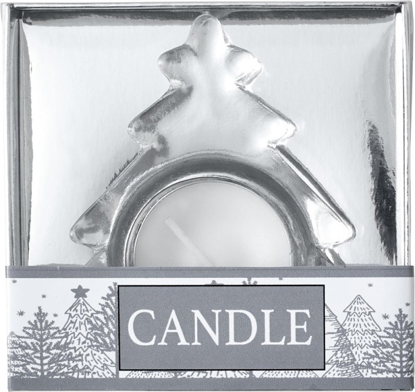 Teelichthalter 'X-MAS Tree' aus Glas im Tannenbaum-Design, inklusive Teelicht, verpackt in einer farbigen Geschenkbox mit Klarsichtdeckel und Schleife.